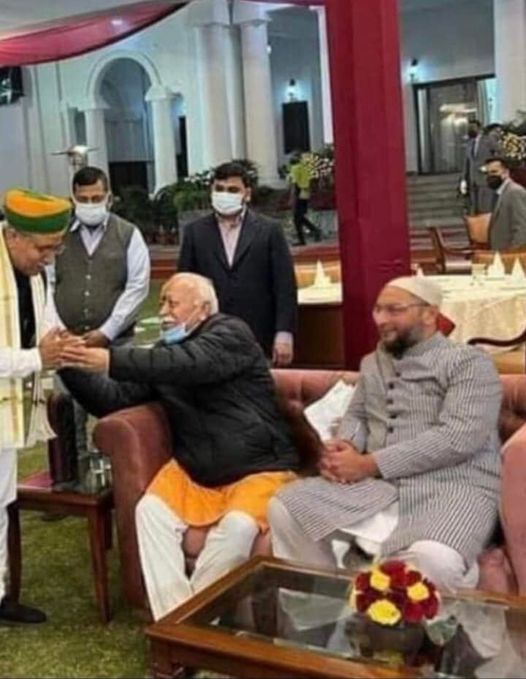 RSS தலைவர் மோகன் பகவத்துடன் ஏஐஎம்ஐஎம் கட்சியின் தலைவரும் ஹைதராபாத் நாடாளுமன்ற உறுப்பினருமான அசாதுதீன் ஓவைசி இருப்பதாக கூறி புகைப்படம் ஒன்று சமூக வலைத்தளங்களில் பரவி வருகின்றது.