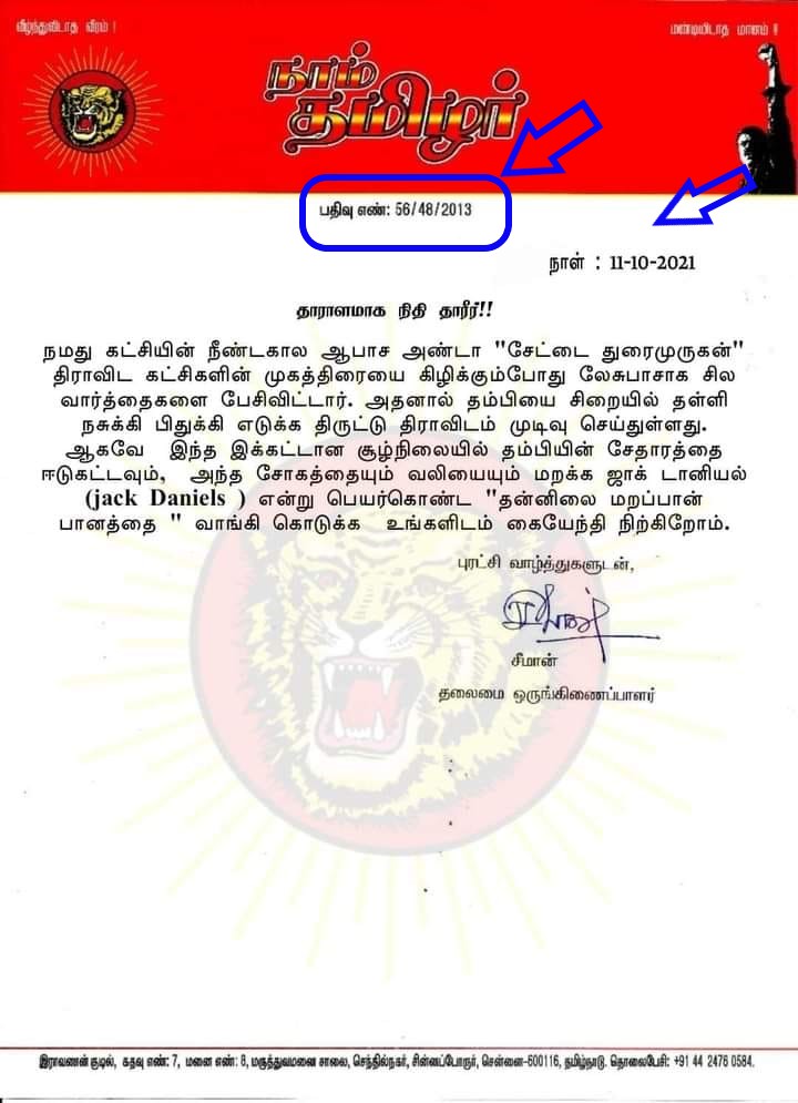 இந்நிலையில் நாதக வெளியிட்டதாக கூறி அறிக்கை ஒன்று சமூக வலைத்தளங்களில் வைரலாகி வருகின்றது. அந்த அறிக்கையில், நமது கட்சியின் நீண்ட கால ஆபாச அண்டா “சேட்டை துரைமுருகன்” திராவிட கட்சிகளின் முகத்திரையை கிழிக்கும்போது லேசுபாசாக சில வார்த்தைகளை பேசிவிட்டார். அதனால் தம்பியை சிறையில் தள்ளி நசுக்கி பிதுக்கி எடுக்க திருட்டு திராவிடம் முடிவு செய்துள்ளது. ஆகவே இந்த இக்கட்டான சூழ்நிலையில் தம்பியின் சேதாரத்தை ஈடுகட்டவும், அந்த சோகத்தையும் வலியையும் மறக்க ஜாக் டேனியல் என்று பெயர்கொண்ட “தன்னிலை மறப்பான்” பானத்தை வாங்கி கொடுக்க உங்களிடம் கையேந்தி நிற்கிறோம்.” என்று குறிப்பிடப்பட்டுள்ளது.