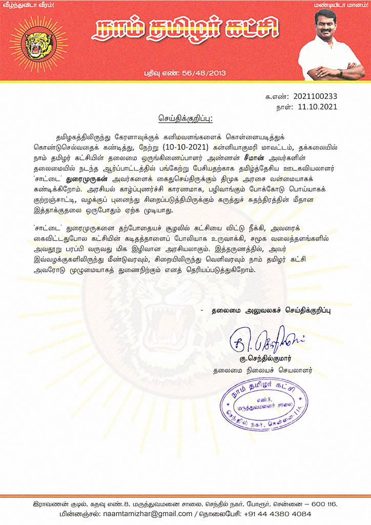 குமரி மாவட்டத்தின் தக்கலை பகுதியில் நாம் தமிழர் கட்சி சார்பில் நடந்த கண்டன ஆர்ப்பாட்டத்தில் தமிழக முதல்வர் மு.க.ஸ்டாலின் மற்றும் காங்கிரஸ் கட்சி குறித்து சர்ச்சைகுரிய கருத்துக்களைப் பேசியுள்ளார் யூடியூபர் சாட்டை துரைமுருகன். இதன் காரணமாக அவர் மீது 7 பிரிவுகளில் வழக்கு பதிவு செய்யப்பட்டு நாங்குநேரி சிறையில் அடைக்கப்பட்டுள்ளார்.