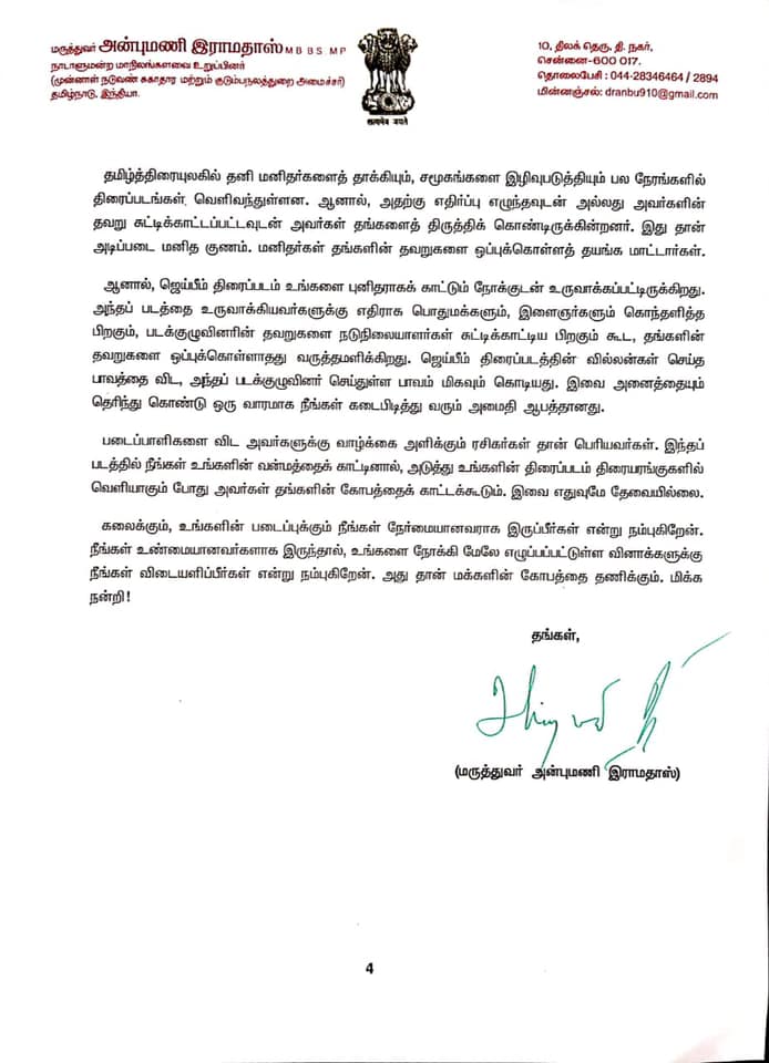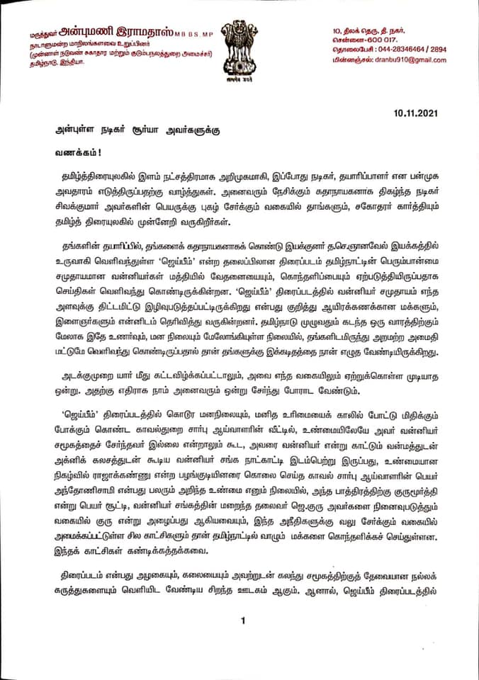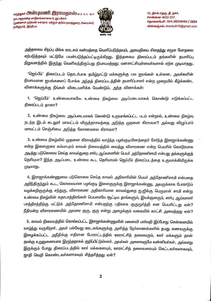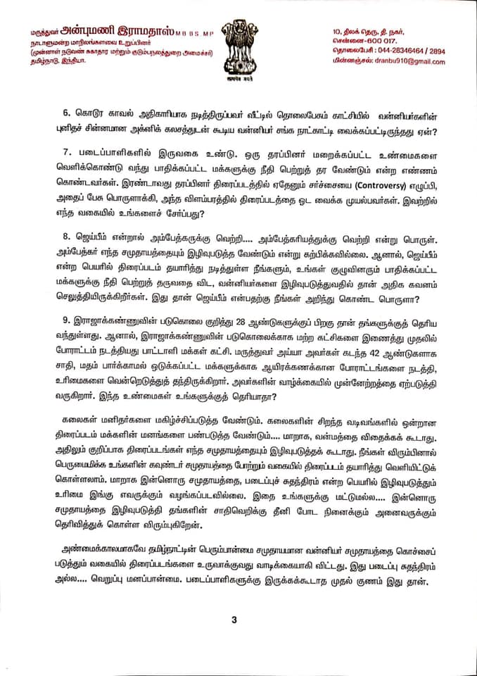 இது ஒருபுறம் இருந்தாலும் இப்படத்தில் வன்னியர்களை தவறாக சித்தரித்ததாக கூறி ஒரு சாரார் இத்திரைப்படத்திற்கு எதிராக குரல் எழுப்பி வருகின்றனர். நாடாளுமன்ற மாநிலங்களவை உறுப்பினர் அன்புமணி ராமதாஸ் அவர்களும் ஜெய் பீம் படம் குறித்து 9 வினாக்களை எழுப்பி சூர்யா அவர்களுக்கு கடிதம் ஒன்றை எழுதி இருந்தார்.
