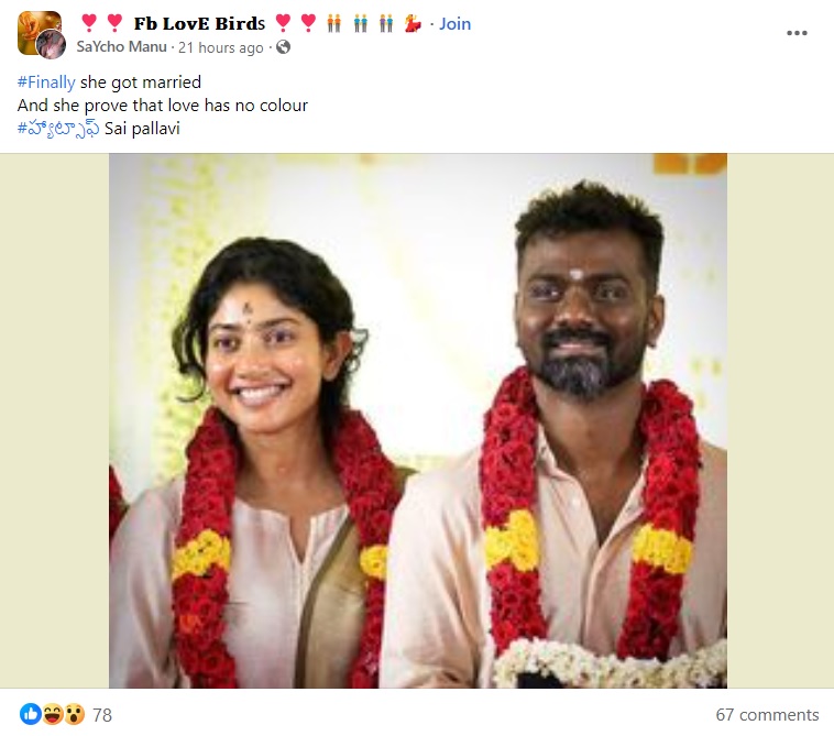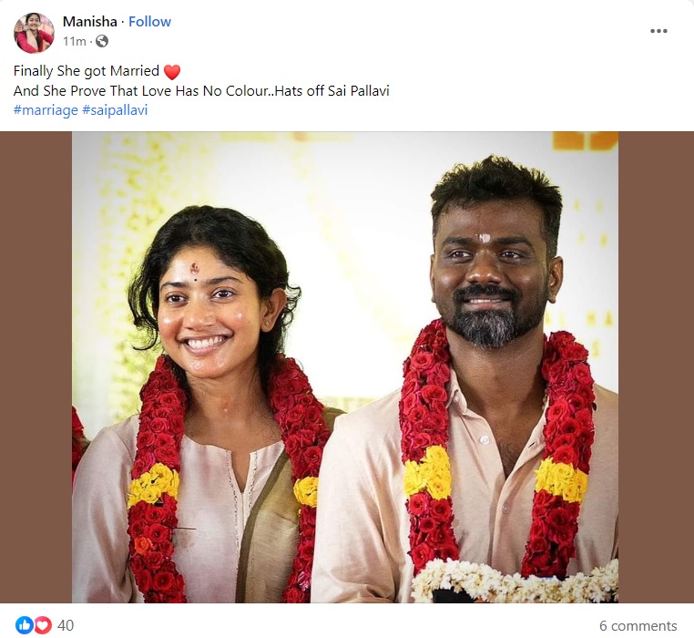 “Finally She got Married And She Prove That Love Has No Colour..Hats off Sai Pallavi” என்று ஆங்கிலப் பதிவுடன் இப்புகைப்படம் பரவி வருகிறது.