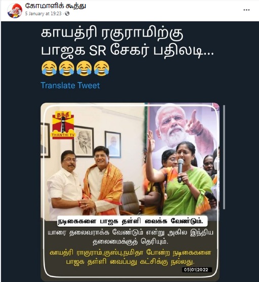 தமிழ்நாடு பாஜக பொருளாளராக பதவி வகிப்பவர் எஸ்.ஆர்.சேகர். அவர் தற்போது, “நடிகைகளை பாஜக தள்ளி வைக்க வேண்டும். யாரை தலைவராக்க வேண்டும் என்று அகில இந்திய தலைமைக்குத் தெரியும். காயத்ரி ரகுராம், குஷ்பு, நமிதா போன்ற நடிகைகளை பாஜக தள்ளி வைப்பது கட்சிக்கு நல்லது” என்று கூறியதாக நியூஸ் கார்டு ஒன்று வைரலாகிறது.