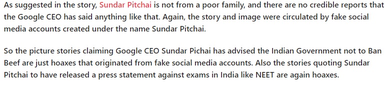 கூகுள் தலைமை செயல் அதிகாரி சுந்தர் பிச்சை, நீட் தேர்வு குறித்து கருத்துக் கூறியதாகப் பரவும் புகைப்படம் தவறானது;நிரூபணமற்றது என்பதை உரிய ஆதாரத்துடன் விளக்கியுள்ளோம்.