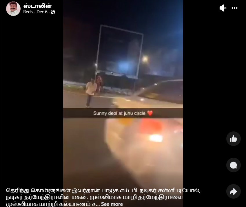 ”தெரிந்து கொள்ளுங்கள் இவர்தான் பாஜக எம். பி. நடிகர் சன்னி டியோல், நடிகர் தர்மேந்திராவின் மகன். முஸ்லிமாக மாறி தர்மேந்திராவை முஸ்லிமாக மாற்றி கல்யாணம் செய்து கொண்டவர்தான் சன்னி டியோளின் அம்மாவுக்கு சக்களத்தியான மதுரா எம்.பி. மாமி ஹேமா மாலினி.” என்று இந்த வீடியோ பரவுகிறது.