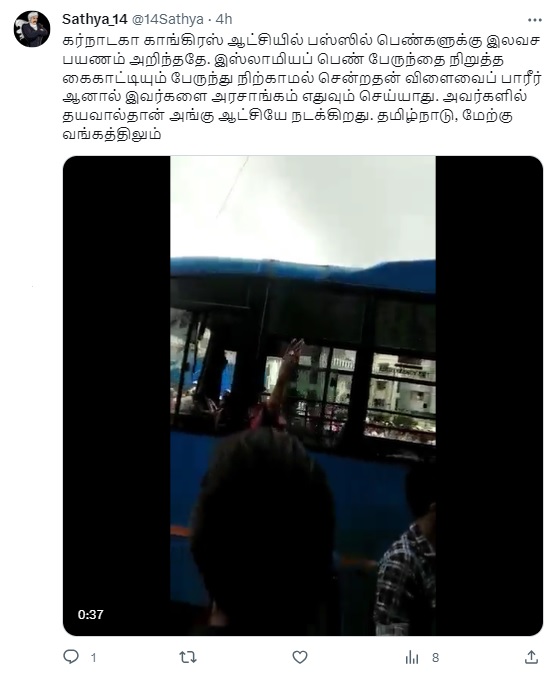 ”கர்நாடகா காங்கிரஸ் ஆட்சியில் பஸ்ஸில் பெண்களுக்கு இலவச பயணம் அறிந்ததே. இஸ்லாமியப் பெண் பேருந்தை நிறுத்த கைகாட்டியும் பேருந்து நிற்காமல் சென்றதன் விளைவைப் பாரீர். ஆனால் இவர்களை அரசாங்கம் எதுவும் செய்யாது. அவர்களில் தயவால்தான் அங்கு ஆட்சியே நடக்கிறது. தமிழ்நாடு, மேற்கு வங்கத்திலும்” என்று இந்த வீடியோ பரவி வருகிறது.