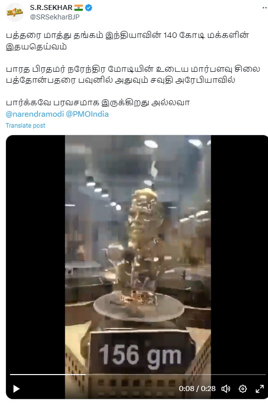 ”பத்தரை மாத்து தங்கம் இந்தியாவின் 140 கோடி மக்களின் இதயதெய்வம் பாரத பிரதமர் நரேந்திர மோடியின் உடைய மார்பளவு சிலை பத்தோன்பதரை பவுனில் அதுவும் சவுதி அரேபியாவில் பார்க்கவே பரவசமாக இருக்கிறது அல்லவா” என்று இந்த வீடியோ வைரலாகிறது. பாஜக மாநில பொருளாளர் எஸ்.ஆர்.சேகர் உள்ளிட்ட பலரும் இதனை சமூக வலைத்தளத்தில் பகிர்ந்து வருகின்றனர்.