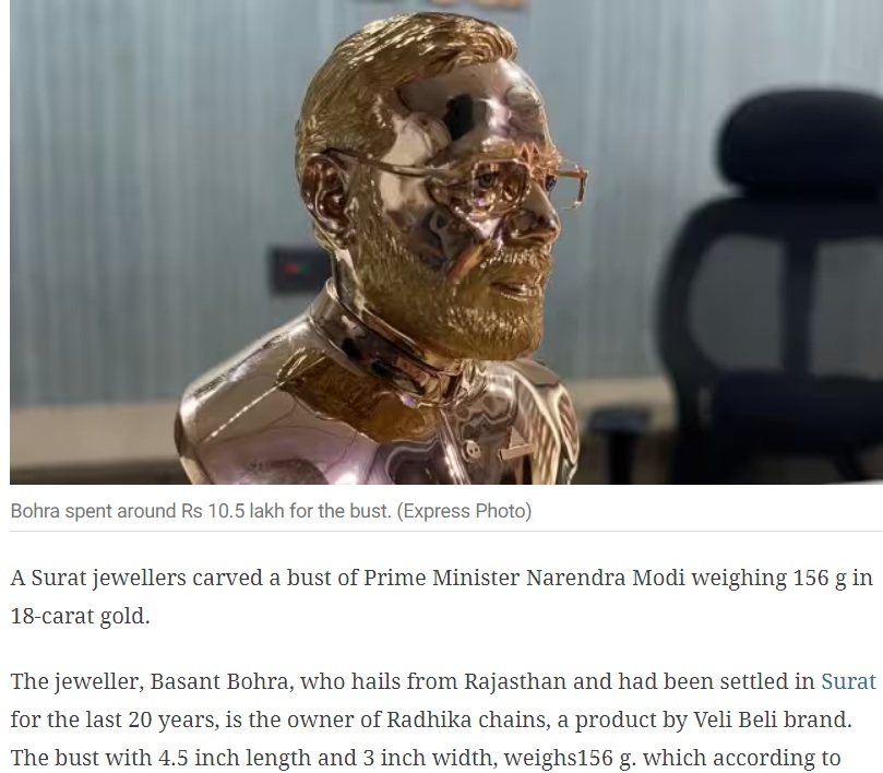 வைரலாகும் வீடியோவை கீ-ப்ரேகளாகப் பிரித்து கீ-வேர்டுகளையும் உபயோகித்து ரிவர்ஸ் சர்ச் முறைக்கு உள்ளாக்கியபோது கடந்த ஜனவரி 20ஆம் தேதியன்று ”Surat jewellers carves PM Narendra Modi’s bust in ‘156 gram gold” என்று Indian Express வெளியிட்டிருந்த செய்தி நமக்குக் கிடைத்தது. அதில் வைரலாகும் வீடியோவில் உள்ள அதே சிலை, புகைப்படமாக இடம்பெற்றிருந்தது.அதில், சூரத்தைச் சேர்ந்த Radhika Chaind (Veli beli) என்னும் நகைக்கடை உரிமையாளரான பசந்த் போஹ்ரா என்பவர் பிரதமர் மோடியின் உருவத்தை 156 கிராம் தங்கத்தில் செய்துள்ளார் என்று தெரிவிக்கப்பட்டுள்ளது.