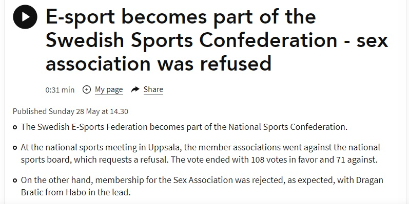 ஐரோப்பிய செக்ஸ் சாம்பியன்ஷிப் விளையாட்டு போட்டி ஸ்வீடனில் நடைபெறவிருப்பதாகவும், உடலுறவை அந்நாடு அதிகாரப்பூர்வ விளையாட்டாக அறிவித்திருப்பதாகவும் தகவல் ஒன்று சமூக வலைத்தளங்களில் பரவியது. சன் நியூஸ் இந்த நியூஸ்கார்டினை டெலிட் செய்து விட்ட நிலையிலும், சமூக வலைத்தளங்களில் இந்த நியூஸ்கார்டும் மேலும் சில ஊடகங்களில் வெளியான இச்செய்தியும் பரவி வருகிறது. தினத்தந்தி, ABP Nadu மற்றும் மாலைமலரும் இச்செய்தியை வெளியிட்டுள்ளனர்.