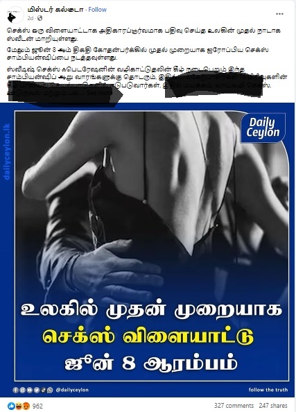 NDTV செய்தியில், “According to the Swedish outlet, there is a Federation of Sex in Sweden and its chief Dragan Bractic called for a championship to be organised…However, the federation’s application to become a member of the National Sports Confederation was denied. Mr Bractic had submitted the application in January this year” என்று விரிவாகத் தெரிவிக்கப்பட்டுள்ளது.