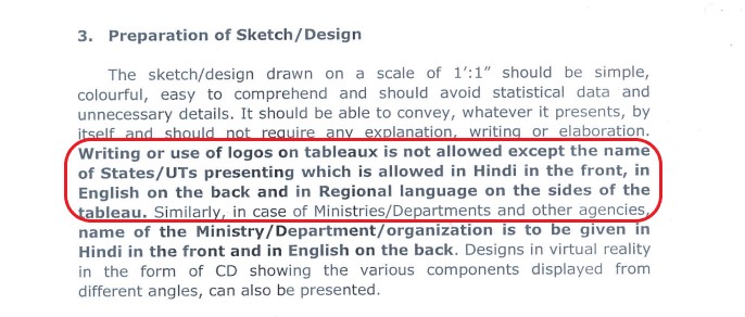 பொதுவாக குடியரசு தின விழாவில் கலந்துக் கொள்ளும் அலங்கார ஊர்திகளுக்கு சில நெறிமுறைகளையும் வழிகாட்டுதல்களையும் மத்திய அரசு சார்பில் வழங்கப்பட்டுள்ளது. அவற்றுள் அலங்கார ஊர்திகளின் முகப்பு பக்கத்தில் மாநிலங்கள் அல்லது யூனியன் பிரதேசங்களின் பெயர் இந்தியிலும், பின்பக்கத்தில் ஆங்கிலத்திலும், பக்கவாட்டு பகுதிகளில் அந்த மாநிலத்தின் மொழியிலும் இடம்பெற வேண்டும் என்பதும் ஒன்றாகும்.