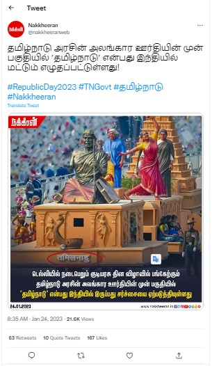 இந்நிலையில், டெல்லியில் நடைபெறும் குடியரசு தின விழாவில் பங்கேற்கும் தமிழ்நாடு அரசின் அலங்கார ஊர்தியின் முன்பகுதியில் ‘தமிழ்நாடு’ என்பது இந்தியில் இருப்பது சர்ச்சையை ஏற்படுத்தியுள்ளதாக நக்கீரன் செய்தி ஒன்றை வெளியிட்டுள்ளது.