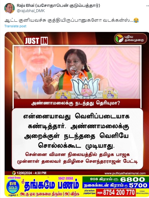 ”அண்ணாமலைக்கு நடந்தது தெரியுமா? என்னையாவது வெளிப்படையாக கண்டித்தார். அண்ணாமலைக்கு அறைக்குள் நடந்ததை வெளியே சொல்லக்கூட முடியாது. சென்னை விமான நிலையத்தில் தமிழக பாஜக முன்னாள் தலைவர் தமிழிசை சௌந்தரராஜன் பேட்டி” என்று இந்த நியூஸ்கார்ட் பரவி வருகிறது.