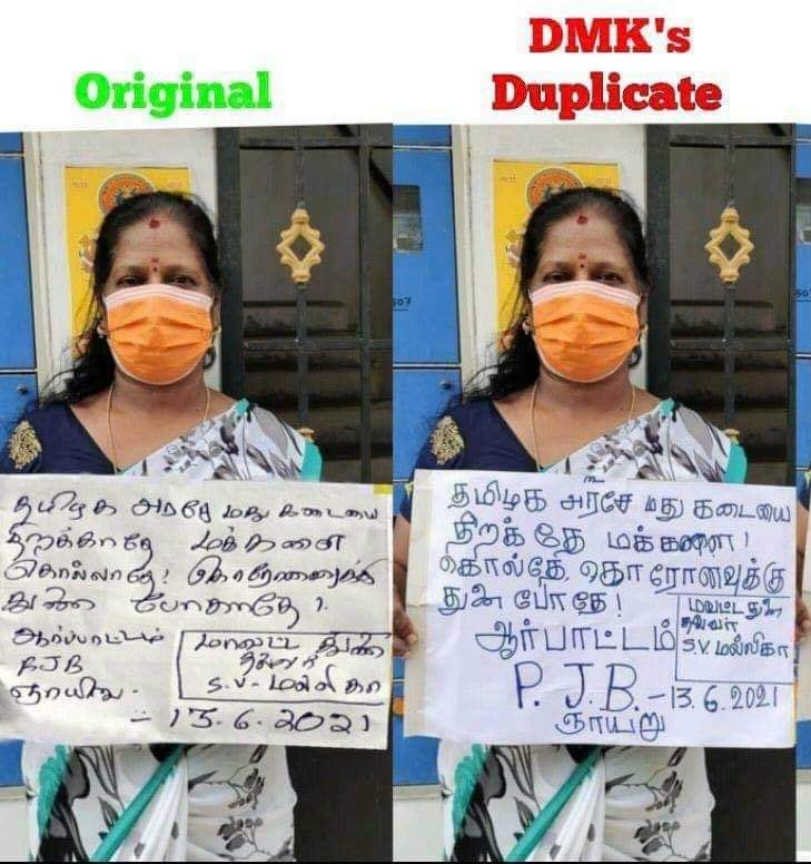 மதுக்கடைகள் திறக்கப்படுவது குறித்து தமிழக அரசுக்கு எதிராக பாஜகவைச் சேர்ந்த பெண் நிர்வாகி ஒருவர் கையில் போஸ்டருடன் போராட்டம் நடத்தியதாக வெளியான புகைப்படம் வைரலாகிய நிலையில், அதில் எழுத்துப்பிழைகள் அதிகமாக இருந்தன. இந்நிலையில், திமுகவினர் திட்டமிட்டு இதனைப் போட்டோஷாப் செய்துள்ளதாக மற்றொரு புகைப்படமும் சமூக வலைத்தளங்களில் வைரலாகிறது.