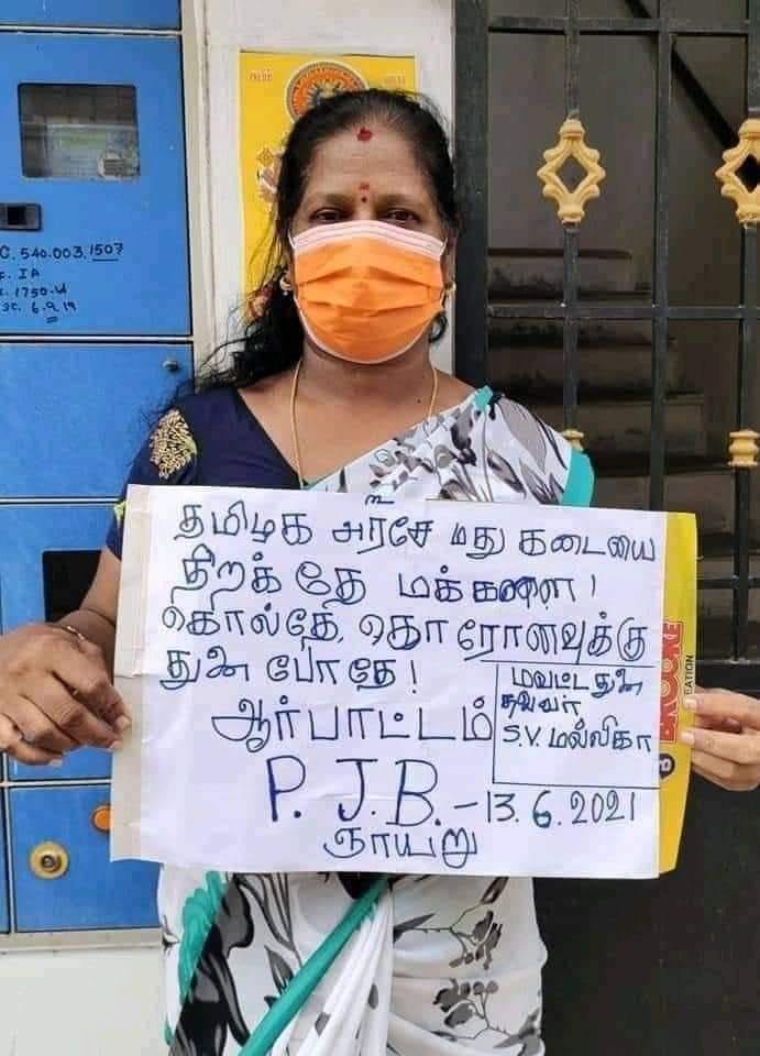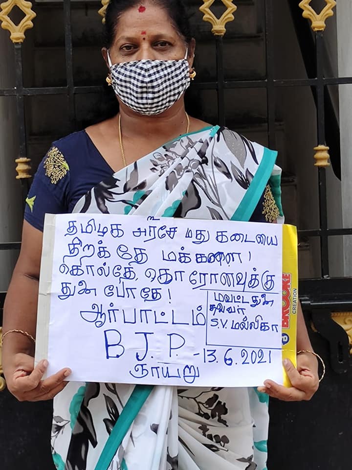 அப்போராட்டத்தில் கலந்து கொண்ட பாஜகவைச் சேர்ந்த மல்லிகா என்பவர் கைகளில் “தமிழக அரசே மது கடையை திறக்தே மக்களை கொல்தே கொரோனவுக்கு துணை போதே. ஆர்ப்பாட்டம் மாவட்ட துணை தலைவர் S.V.மல்லிகா. P.J.B 13.6.2021 ஞாயறு” என்று எழுத்துப்பிழைகள் அதிகளவில் காணப்படும் அளவிலான போஸ்டருடன் காணப்பட்டார். இப்புகைப்படம் சமூக வலைத்தளங்களில் வைரலாகியது.
