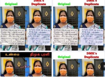 மேலும், திமுகவினரால் போட்டோஷாப் செய்யப்பட்ட புகைப்படம் என்று பரவும் படத்தில் அவரது கைகள் நன்கு போஸ்டரில் பதிந்துள்ளன. ஆனால், உண்மையான புகைப்படம் என்று பகிரப்படும் புகைப்படத்தில் அவரது கைகளுக்கு மேலாக குறிப்பிட்ட போஸ்டர் காணப்படுகிறது.