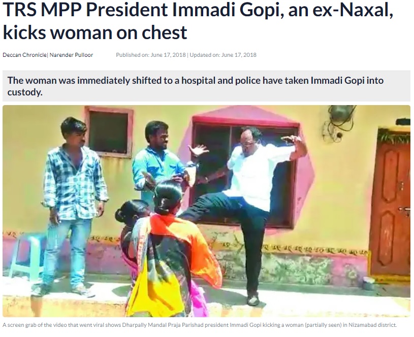 வைரலாகும் வீடியோவை ரிவர்ஸ் சர்ச் முறைக்கு உள்ளாக்கியபோது deccan chronicle கடந்த ஜூன் 18, 2018ல் வெளியிட்டிருந்த செய்தி ஒன்று நமக்குக் கிடைத்தது. ”TRS MPP President Immadi Gopi, an ex-Naxal, kicks woman on chest” என்கிற தலைப்பில் வெளியாகியிருந்த அந்த செய்தியில் தற்போது வைரலாகும் வீடியோவின் காட்சி புகைப்படமாக இடம்பெற்றுள்ளது.