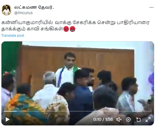கன்னியாகுமரியில் வாக்கு சேகரிக்க சென்ற பாதிரியாரைத் தாக்கும் மக்கள் என்று பரவும் வீடியோ தெலுங்கானவைச் சேர்ந்தது என்பது நமக்கு கிடைத்த ஆதாரங்களின் வாயிலாக தெளிவாகியுள்ளது.