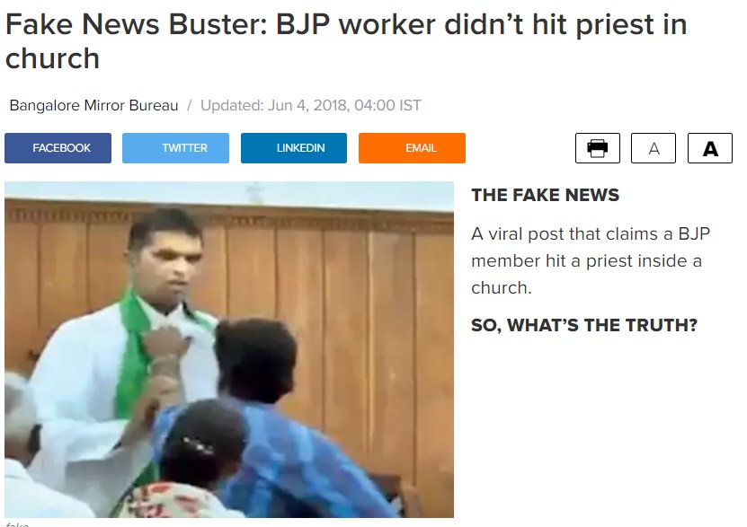 ”Fake News Buster: BJP worker didn’t hit priest in church” என்று இந்த செய்தி ஜூன் 04, 2018 அன்று வெளியிடப்பட்டிருந்தது. அதில், வைரல் வீடியோவில் உள்ள பாதிரியாரின் புகைப்படம் இடம்பெற்றுள்ளது. ”தெலுங்கானாவில் தேவாலய உறுப்பினராக இருந்தவர் பாதிரியாரைத் தாக்கும் காட்சி இது. இதில் எந்தவித அரசியல் கோணமும் இல்லை” என்று அந்த செய்தியில் தெரிவிக்கப்பட்டிருந்தது.