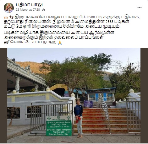 இந்நிலையில், “திருமலையில் பழைய பாதையில் 6588 படிகளுக்கு பதிலாக, தற்போது ரிலையன்ஸ் நிறுவனம் அமைத்துள்ள 2388 படிகள் மட்டுமே ஏறி திருமலையை சீக்கிரமே அடைய முடியும். படிகள் வழியாக திருமலையை அடைய ஆர்வமுள்ள அனைவருக்கும் இந்தத் தகவலைப் பரப்புங்கள். ஶ்ரீ வெங்கடேசாய நமஹ” என்கிற செய்தி ஒன்று சமூக வலைத்தளங்களில் வைரலாகிறது.