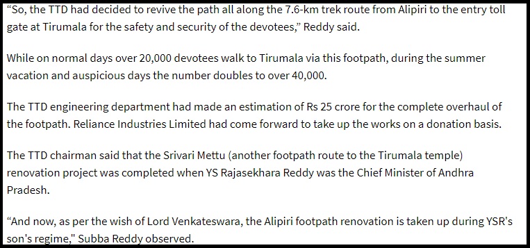 தொடர்ந்து, ரிலையன்ஸ் குறித்த செய்திகளைத் தேடியபோது அலிபிரி பாதை படிகளின் சீரமைப்பு மற்றும் மேற்கூரை சீரமைப்பிற்கு சில கோடிகள் செலவாகும் என்று தேவஸ்தானம் தரப்பில் ஆய்வு செய்த நிலையில் அதற்கான செலவுகளை ரிலையன்ஸ் இண்டஸ்ட்ரீஸ் ஏற்றுக் கொள்வதாக அறிவித்துள்ளதாக செய்திகள் வெளியாகியுள்ளன.