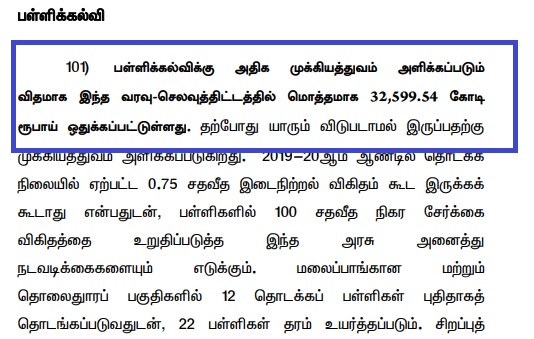 தொடர்ந்து, பள்ளிக்கல்வித்துறைக்கு உண்மையில் தமிழக பட்ஜெட்டில் எவ்வளவு நிதி ஒதுக்கப்பட்டுள்ளது என்பதை ஆராய்கையில், வரிசை எண் 101ல் பள்ளிக்கல்வி என்கிற தலைப்பின் கீழ், “பள்ளிக்கல்விக்கு அதிக முக்கியத்துவம் அளிக்கப்படும் விதமாக இந்த வரவு-செலவு திட்டத்தில் மொத்தமாக 32,599.54 கோடி ரூபாய் ஒதுக்கப்பட்டுள்ளது” என்று தெரிவிக்கப்பட்டுள்ளது.