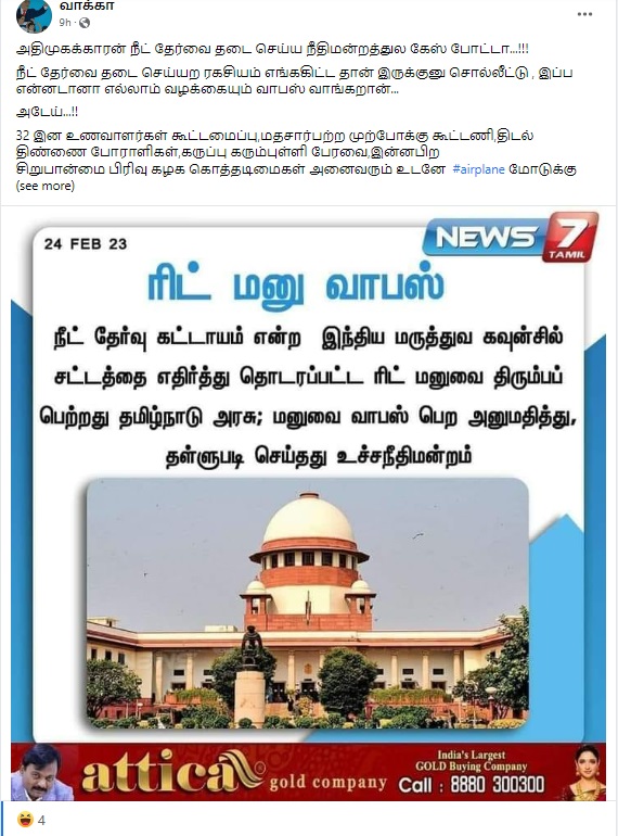 நீட் தேர்வுக்கு எதிராக தொடரப்பட்ட மனுவை தமிழக அரசு வாபஸ் பெற்றதாக பரவும் செய்தி குறித்த உண்மையறிய அதுகுறித்த ஆய்வில் ஈடுபட்டோம்.