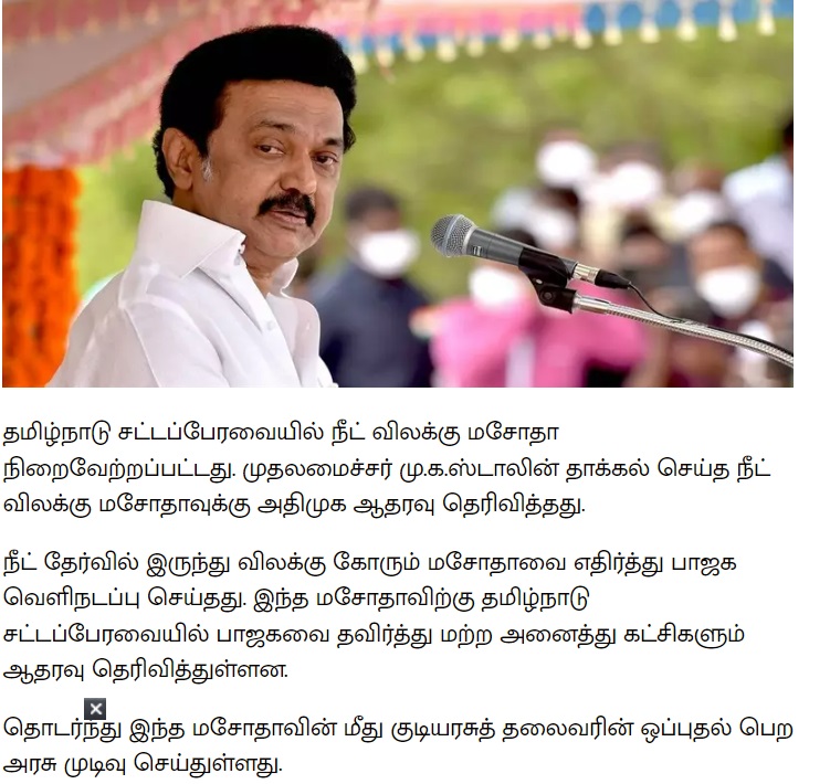 நீட் தேர்வு விலக்கு சட்ட மசோதா குடியரசுத்தலைவரின் ஒப்புதலைப் பெறுவதற்காக கடந்த 2021 ஆம் ஆண்டு செப்டம்பர் மாதம் ஆளுநருக்கு அனுப்பப்பட்ட நிலையில், 2022ஆம் ஆண்டு பிப்ரவரியில் ஆளுநர் அதை தமிழ்நாடு அரசுக்கு திருப்பி அனுப்பியிருந்தார். எனவே, நீட் விலக்கு மசோதாவை திமுக அரசு பிப்ரவரி 08, 2022 அன்று தமிழ்நாடு சட்டமன்றக்கூட்டத்தில் மீண்டும் நிறைவேற்றியது.