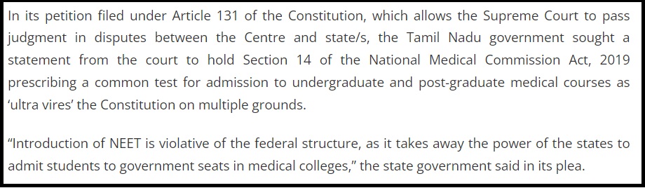 கடந்த 2020ஆம் ஆண்டு ஆட்சியில் இருந்த அதிமுக அரசு, மருத்துவப் படிப்புக்கு நீட் தேர்வு கட்டாயம் என்கிற சட்டத்திருத்தத்தை எதிர்த்து உச்சநீதிமன்றத்தில் ரிட் மனு தாக்கல் செய்தது.