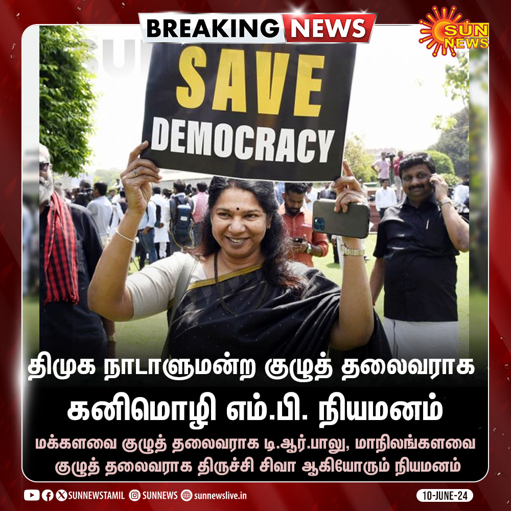 வைரலாகும் நியூஸ்கார்ட் சன்நியூஸ் வெளியிட்டதாகப் பரவிய நிலையில் அவர்களுடைய அதிகாரப்பூர்வ சமூக வலைத்தளப்பக்கத்தில் ஆராய்ந்தோம். அதில், “திமுக நாடாளுமன்ற குழுத் தலைவராக கனிமொழி எம்.பி. நியமனம்!” என்று வெளியிடப்பட்டிருந்த நியூஸ்கார்டில் ’Save Democracy’ என்கிற பதாகையையே கைகளில் ஏந்தியுள்ளார் கனிமொழி.