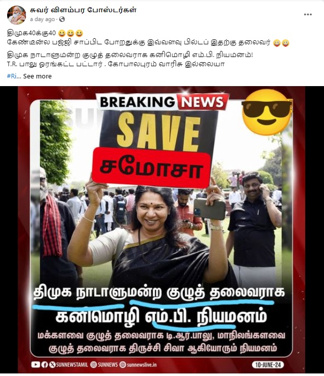 ” திமுக 40க்கு40 கேண்டீன்ல பஜ்ஜி சாப்பிட போறதுக்கு இவ்வளவு பில்டப் இதற்கு தலைவர் திமுக நாடாளுமன்ற குழுத் தலைவராக கனிமொழி எம்.பி. நியமனம்! T.R. பாலு ஓரங்கட்ட பட்டார் . கோபாலபுரம் வாரிசு இல்லையா” என்று இந்த நியூஸ்கார்ட் பரவுகிறது. இதனை உண்மையென்று நம்பி ஷேர் செய்து வருகின்றனர்.