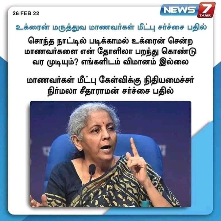 இந்நிலையில், “மாணவர்கள மீட்பதில் ஏன் தாமதம் என்ற கேள்விக்கு, “சொந்த நாட்டில் படிக்காமல் உக்ரைன் சென்ற மாணவர்களை என் தோளில் வைத்தா பறந்து கொண்டு வர முடியும்”” என்று மத்தியமைச்சர் நிர்மலா சீதாராமன் கூறியதாக நியூஸ்கார்டுகள் சில வைரலாகி வருகின்றது.