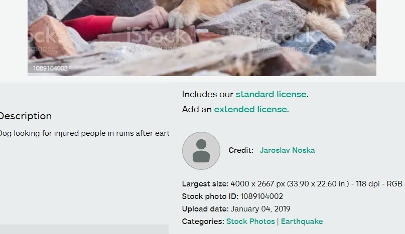 மூன்றாவதாக இடம்பெற்றுள்ள நாய் ஒன்று இடிபாடுகளில் சிக்கிய ஒருவரிடம் அமர்ந்திருக்கும் புகைப்படத்தை ரிவர்ஸ் இமேஜ் சர்ச் செய்தபோது, அப்புகைப்படம் 2021 ஆம் ஆண்டு வெளியான American Kennel Club கட்டுரை ஒன்றில் நமக்குக் காணக்கிடைத்தது. மேலும், Alamy ஸ்டாக் இணையதளத்திலும் 2018 ஆம் ஆண்டு இப்புகைப்படம் காணக்கிடைத்தது.