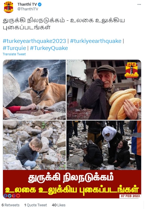 துருக்கி நிலநடுக்கம் – உலகை உலுக்கிய புகைப்படங்கள் என்று தந்தி டிவி உட்பட பலரும் பகிரும் புகைப்படங்களில் பலவும் தற்போதைய நிலநடுக்க நிகழ்வுடன் தொடர்புடையது அல்ல என்பது நமக்கு கிடைத்த ஆதாரங்களின் வாயிலாக தெளிவாகியுள்ளது.