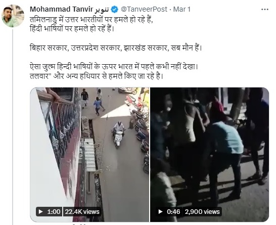 அதேபோன்று வடமாநில தொழிலாளர்கள், குறிப்பாக பீகார் தொழிலாளர்கள் தாக்கப்பட்டதாக ’’North Indians are being attacked in Tamil Nadu, Hindi speaking people are being attacked. Government of Bihar, Government of Uttar Pradesh, Government of Jharkhand, all are silent. Such oppression on Hindi speaking people has never been seen before in India. Attacks are being made with “sword” and other weapons.” என்பதாகவும் வீடியோக்கள் பரவி வருகின்றன.