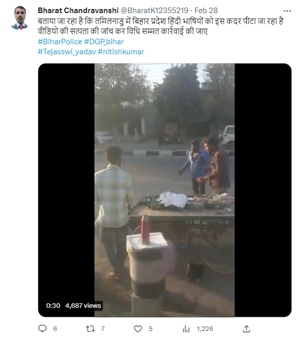 ”It is being told that in Tamil Nadu, Bihar, Hindi speaking people are being beaten to such an extent that legal action should be taken after checking the veracity of the video.” என்பதாக இந்தியில் வீடியோ ஒன்று சமூக வலைத்தளங்களில் பரவி வருகிறது.