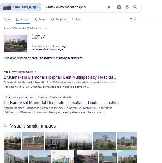 தேடலின் முடிவில், குறிப்பிட்ட அந்த புகைப்படத்தில் இடம் பெற்றிருக்கும் மருத்துவமனை டாக்டர் காமாட்சி நினைவு மருத்துவமனை என்பதும், அம்மருத்துவமனை சென்னை பள்ளிக்கரணையில் அமைந்திருப்பதும் நமக்கு உறுதியானது.