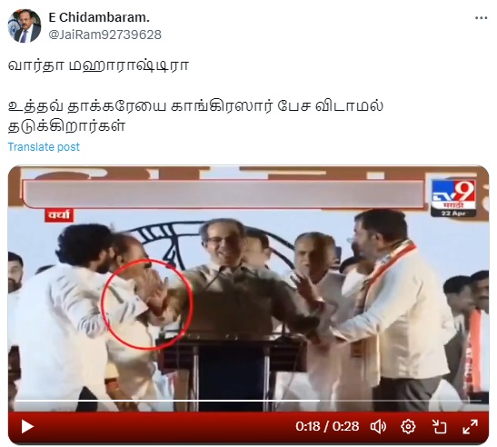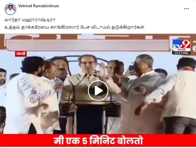 அதில், மகாராஷ்டிரா வர்தாவில் நடைபெற்ற பொதுக்கூட்டத்தில் மேடையில் பேசிக்கொண்டிருக்கும் உத்தவ் தாக்கரேயிடம் காங்கிரஸார் பேசியபிறகு அவர் மீண்டும் தடையின்றி மேடையில் பேசுவதை நம்மால் கண்டறிய முடிந்தது. இதுகுறித்த செய்திகளும் ஊடகங்களில் வெளியாகியுள்ளது.