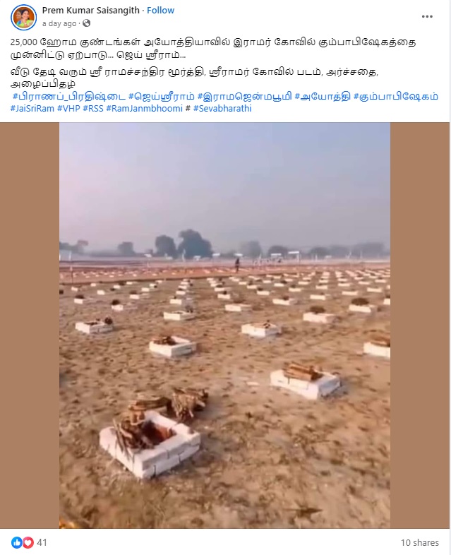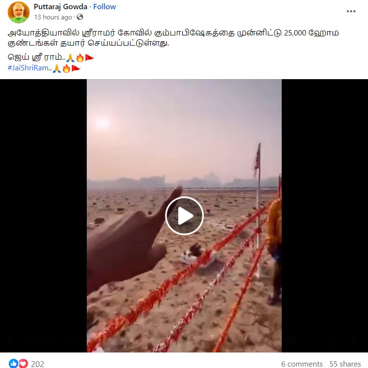 அயோத்தியில் ராமர் கோயில் குடமுழுக்கிற்காக 25,000 ஹோமகுண்டங்கள் அமைக்கப்பட்டுள்ளதாக வீடியோ ஒன்று சமூக வலைத்தளங்களில் பரவி வருகிறது.