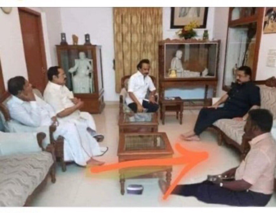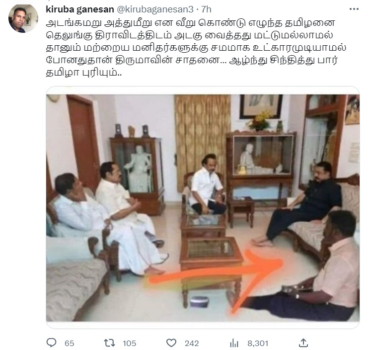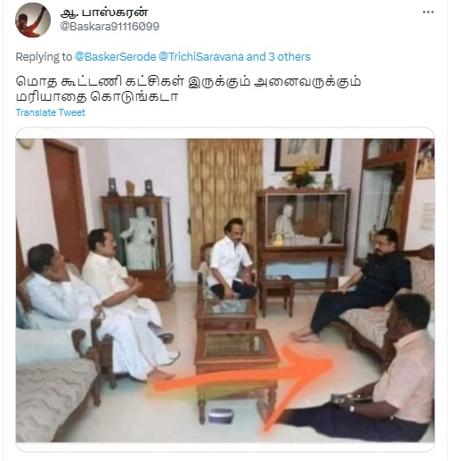 “அடங்கமறு அத்துமீறு என வீறு கொண்டு எழுந்த தமிழனை தெலுங்கு திராவிடத்திடம் அடகு வைத்தது மட்டுமல்லாமல் தானும் மற்றைய மனிதர்களுக்கு சமமாக உட்காரமுடியாமல் போனதுதான் திருமாவின் சாதனை… ஆழ்ந்து சிந்தித்து பார் தமிழா புரியும்” என்பதாகவும், வேறு சில பதிவுகளுடனும் இப்புகைப்படம் வைரலாகிறது.