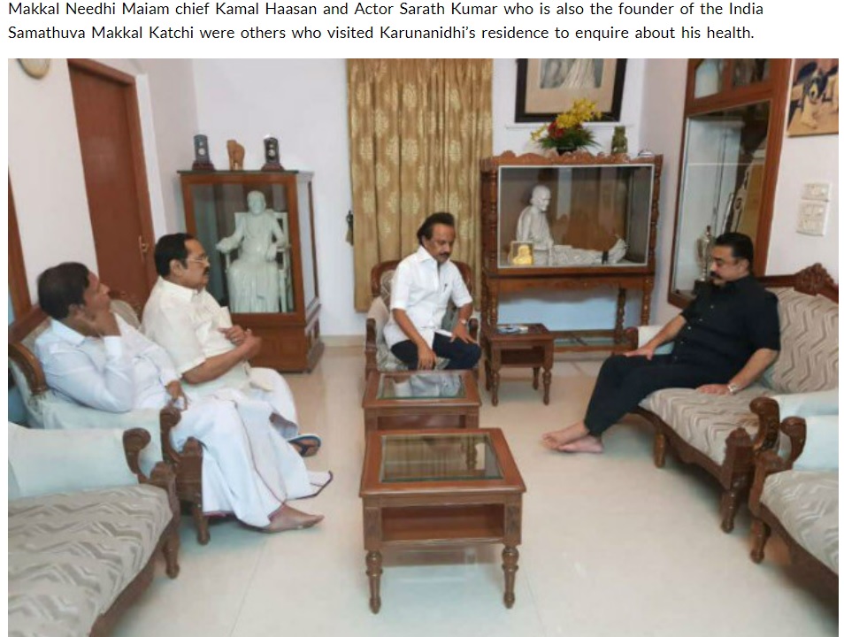 மேலும், The News Minute, The Indian Express உள்ளிட்ட செய்தித்தளங்களில் திருமாவளவன், முதலமைச்சர் மு.க.ஸ்டாலினைச் சந்தித்து கருணாநிதியின் உடல்நலம் குறித்து விசாரித்த புகைப்படமும் இடம்பெற்றுள்ளது. அதில், இருக்கையில் அமர்ந்து மு.க.ஸ்டாலினுடன் பேசிக்கொண்டிருக்கிறார் திருமாவளவன்.