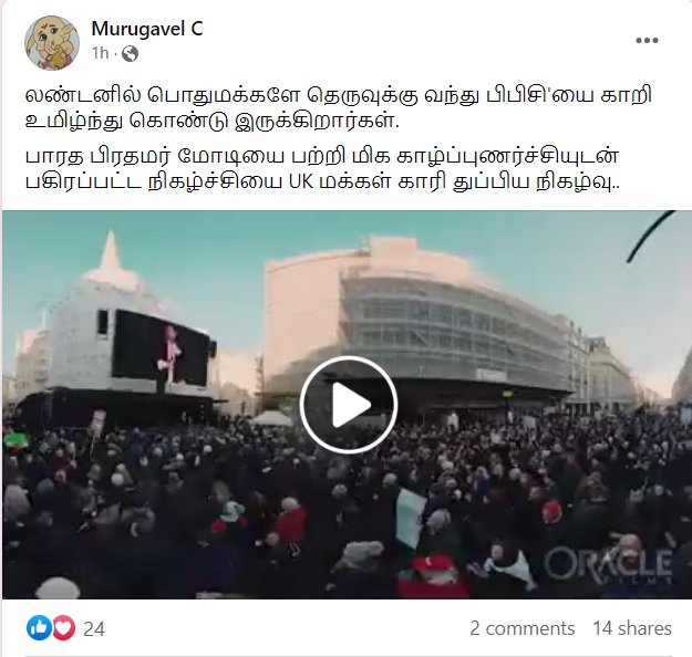 “லண்டனில் பொதுமக்களே தெருவுக்கு வந்து பிபிசி’யை காறி உமிழ்ந்து கொண்டு இருக்கிறார்கள். பாரத பிரதமர் மோடியை பற்றி மிக காழ்ப்புணர்ச்சியுடன் பகிரப்பட்ட நிகழ்ச்சியை UK மக்கள் காரி துப்பிய நிகழ்வு” என்கிற அடைமொழியுடன் வீடியோ ஒன்று பரவி வருகிறது.