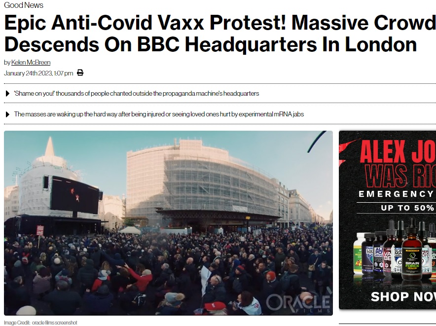 பரவும் வீடியோவில், “Truth To Be Told” என்று குறிப்பிட்டிருந்த நிலையில், கீ-வேர்டுகள் மூலமாக கூகுளில் தேடினோம். அதன்முடிவில், InfoWars என்கிற செய்தி இணையதளம் வெளியிட்டிருந்த ”Epic Anti-Covid Vaxx Protest! Massive Crowd Descends On BBC Headquarters In London” என்கிற செய்திக்கட்டுரை நமக்குக் கிடைத்தது.