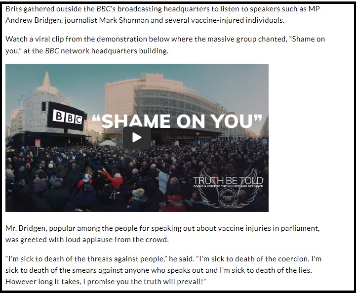தொடர்ந்து, இந்த கட்டுரையில் வைரலாகும் வீடியோவும் இடம்பெற்றிருந்தது. அக்கட்டுரையில், “எம்பி ஆண்ட்ரோ பிரிட்ஜ்டன், பத்திரிக்கையாளர் மார்க் ஷர்மன் மற்றும் கோவிட் தடுப்பூசியால் பாதிக்கப்பட்டவர்களின் உரையை கேட்க பிபிசி தலைமையிடத்திற்கு வெளியில் குவிந்த பிரிட் மக்கள்” என்று தெரிவிக்கப்பட்டுள்ளது. மேலும், “பிபிசி தலைமையகத்திற்கு வெளியே மக்கள் கூட்டம் “Shame on you” என்று கோஷமிட்ட வீடியோ” என்கிற தலைப்பில் வைரலாகும் வீடியோ பதிவிடப்பட்டுள்ளது.