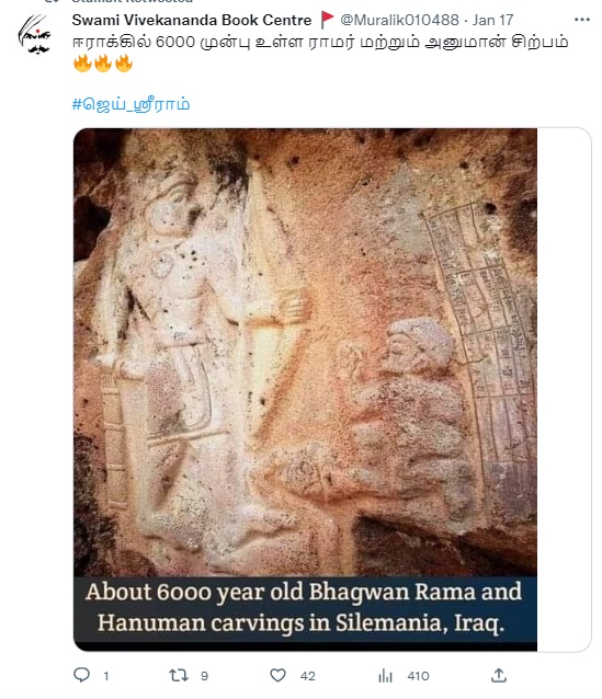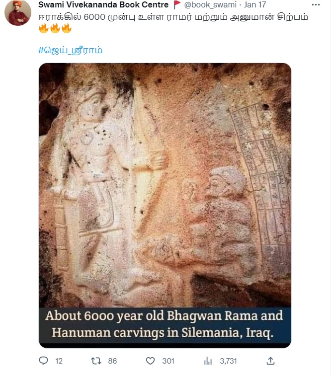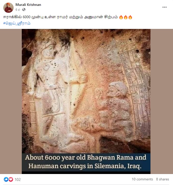 ஈராக்கில் அமைந்துள்ள 6000 ஆண்டுகளுக்கு முந்தைய ராமர்-அனுமன் சிற்பம் என்று பரவும் புகைப்படத்தகவல் குறித்த உண்மையறிய அதுகுறித்த ஆய்வில் ஈடுபட்டோம்.