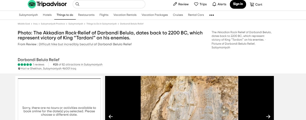 Tripadvisor பக்கத்திலும் இடம்பெற்றுள்ள இப்புகைப்படம், “The Akkadian Rock-Relief of Darbandi Belula, dates back to 2200 BC, which represents victory of King ‘Tardoni’ on his enemies. – Picture of Darbandi Belula Relief, Sulaymaniyah.” என்கிற தலைப்புடன் இடம்பெற்றுள்ளது.