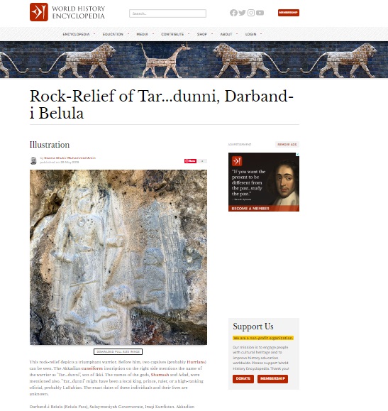 இதையே முக்கியத் தகவலாகக் கொண்டு “Darband-I Belula Sirwan” என்கிற கீ-வேர்ட் மூலமாகத் தேடியபோது அது நம்மை கடந்த மே 29, 2019ஆம் ஆண்டு வெளியான World History Encyclopaedia கட்டுரை ஒன்றிற்கு கொண்டு சென்றது. அதிலும் குறிப்பிட்ட புகைப்படத்தலைப்பு “Rock-Relief of Tar…dunni, Darband-i Belula” என்று தெரிவிக்கப்பட்டுள்ளது.