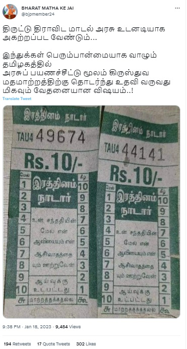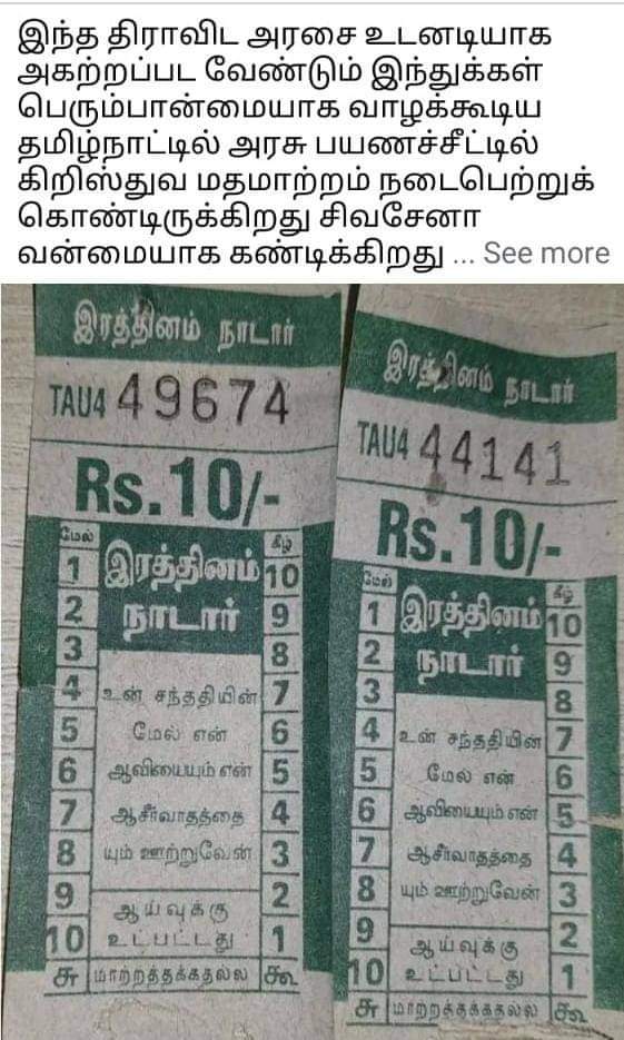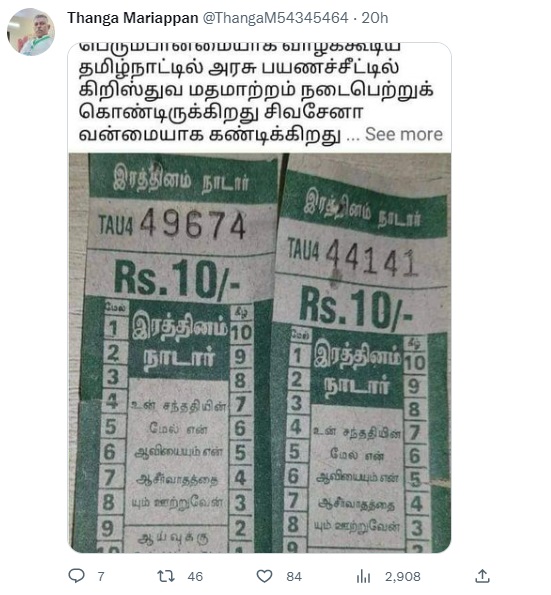 Crap செய்யப்பட்டு அரசுப் பேருந்து பயணச்சீட்டில் மத வாசகங்கள் என்பதாகப் பரவும் புகைப்படத்தின் முழுமையான புகைப்படம் அப்பதிவில் இடம்பெற்றிருந்ததுடன், “நாகர்கோவில் இரத்தினம் நாடார் தனியார் பேருந்தில் மதப் பிரச்சார வாசகம்! அவர்கள் போட்ட பிச்சையில் வந்த அரசு கண்டிப்பாக நடவடிக்கை எடுக்காது என நம்புவோம்?