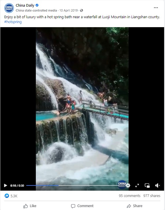 தொடர்ந்து, Thermal Waterfall, Luoji Mountain, Sichuan, China உள்ளிட்ட கீ-வேர்டுகளைக் கொண்டு கூகுளில் தேடியபோது அது கடந்த ஏப்ரல் 19, 2019ல் பதிவிடப்பட்ட China Daily பேஸ்புக் பக்க பதிவிற்கு நம்மை இட்டுச் சென்றது. அதில், இரண்டாவது ப்ரேமில் உள்ள அதே புகைப்படம் இடம் பெற்றிருந்தது. “Enjoy a bit of luxury with a hot spring bath near a waterfall at Luoji Mountain in Liangshan county. #hotspring.” என்கிற பதிவுடன் அப்புகைப்படம் பதிவாகியிருந்தது.