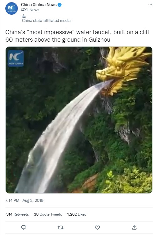 தொடர்ந்து, China Xinhua News பதிவிட்டிருந்த ஆகஸ்ட் 2, 2019 ஆம் ஆண்டு ட்வீட் நமக்குக் கிடைத்தது. “China’s “most impressive” water faucet, built on a cliff 60 metres above the ground in Guizhou.” என்று அதில் வீடியோ ஒன்று பதிவிடப்பட்டிருந்தது.