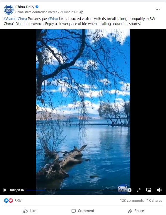 மேலும், கடந்த ஜூன் 29, 2020 அன்று China Daily வெளியிட்டிருந்த யூனான் மாகாணத்தின் Erhai ஏரியின் வீடியோ இடம் பெற்றிருந்தது. இதன்முடிவில், வைரல் வீடியோவில் உள்ள இப்பகுதி, Erhai ஏரி என்பது உறுதியானது.